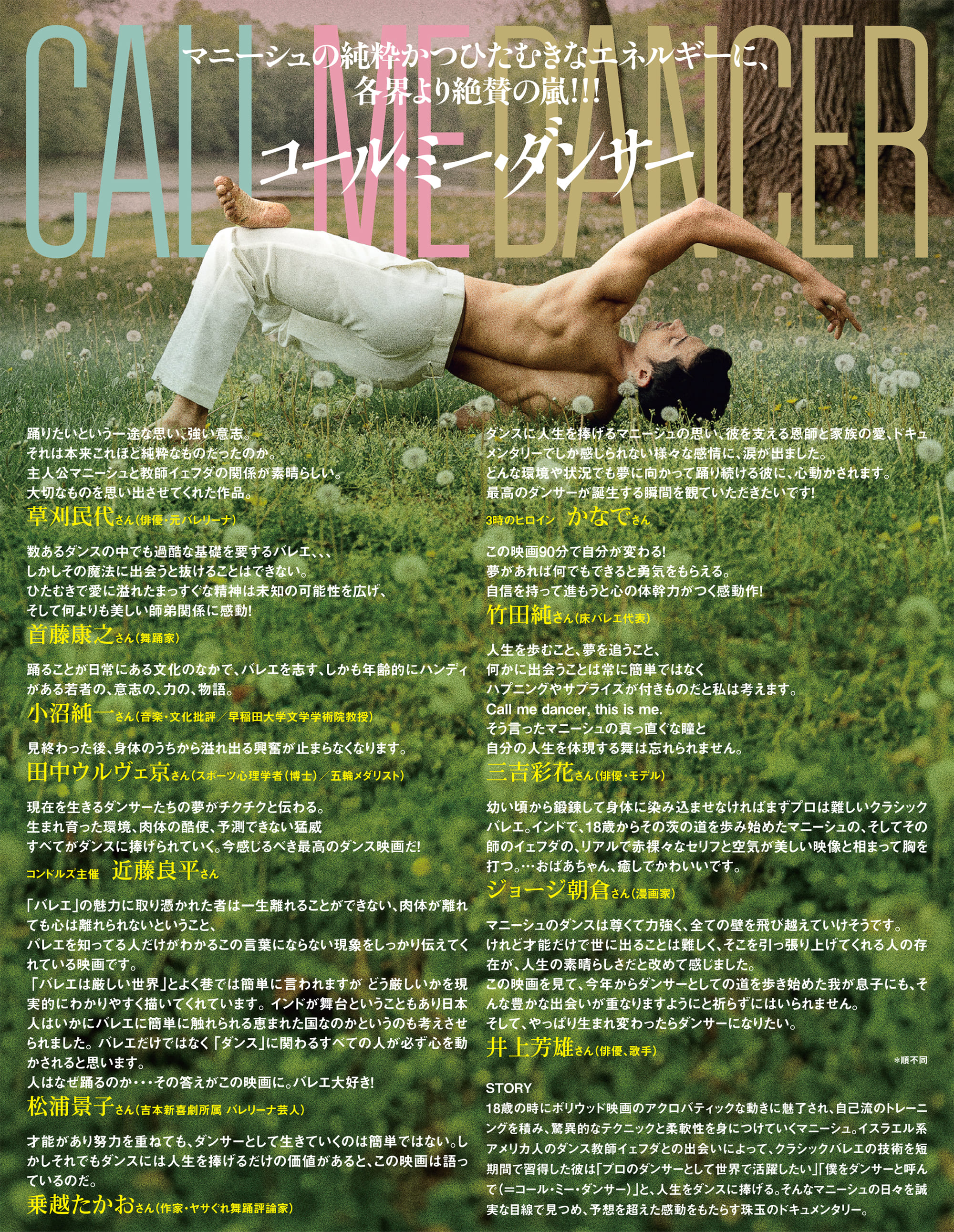 18歳の時にボリウッド映画のアクロバティックな動きに魅了され、自己流のトレーニングを積み、驚異的なテクニックと柔軟性を身につけていくマニーシュ。イスラエル系アメリカ人のダンス教師イェフダとの出会いによって、クラシックバレエの技術を短期間で習得した彼は「プロのダンサーとして世界で活躍したい」「僕をダンサーと呼んで(=コール・ミー・ダンサー)」と、人生をダンスに捧げる。そんなマニーシュの日々を誠実な目線で見つめ、予想を超えた感動をもたらすのが、この『コール・ミー・ダンサー』だ。